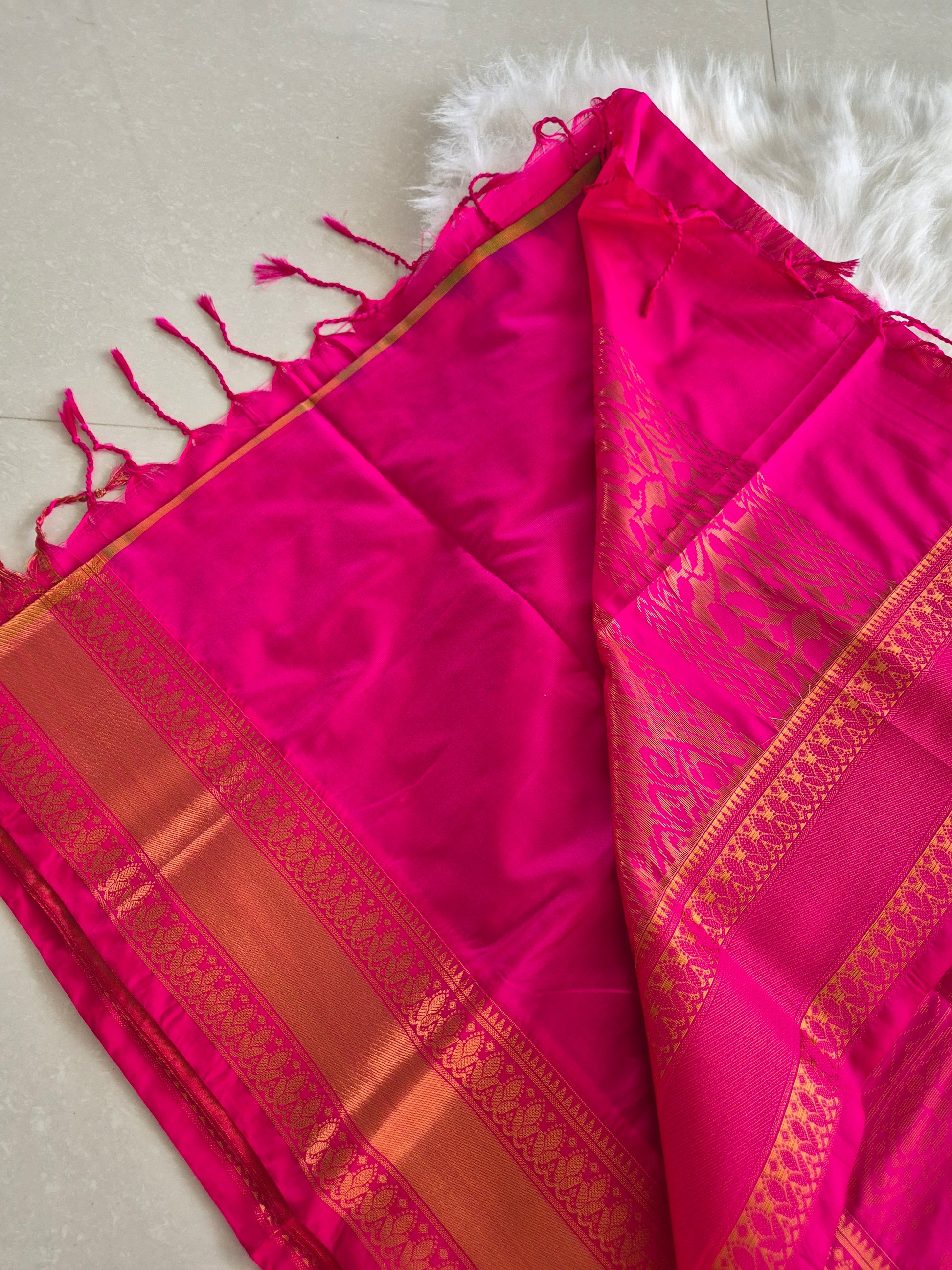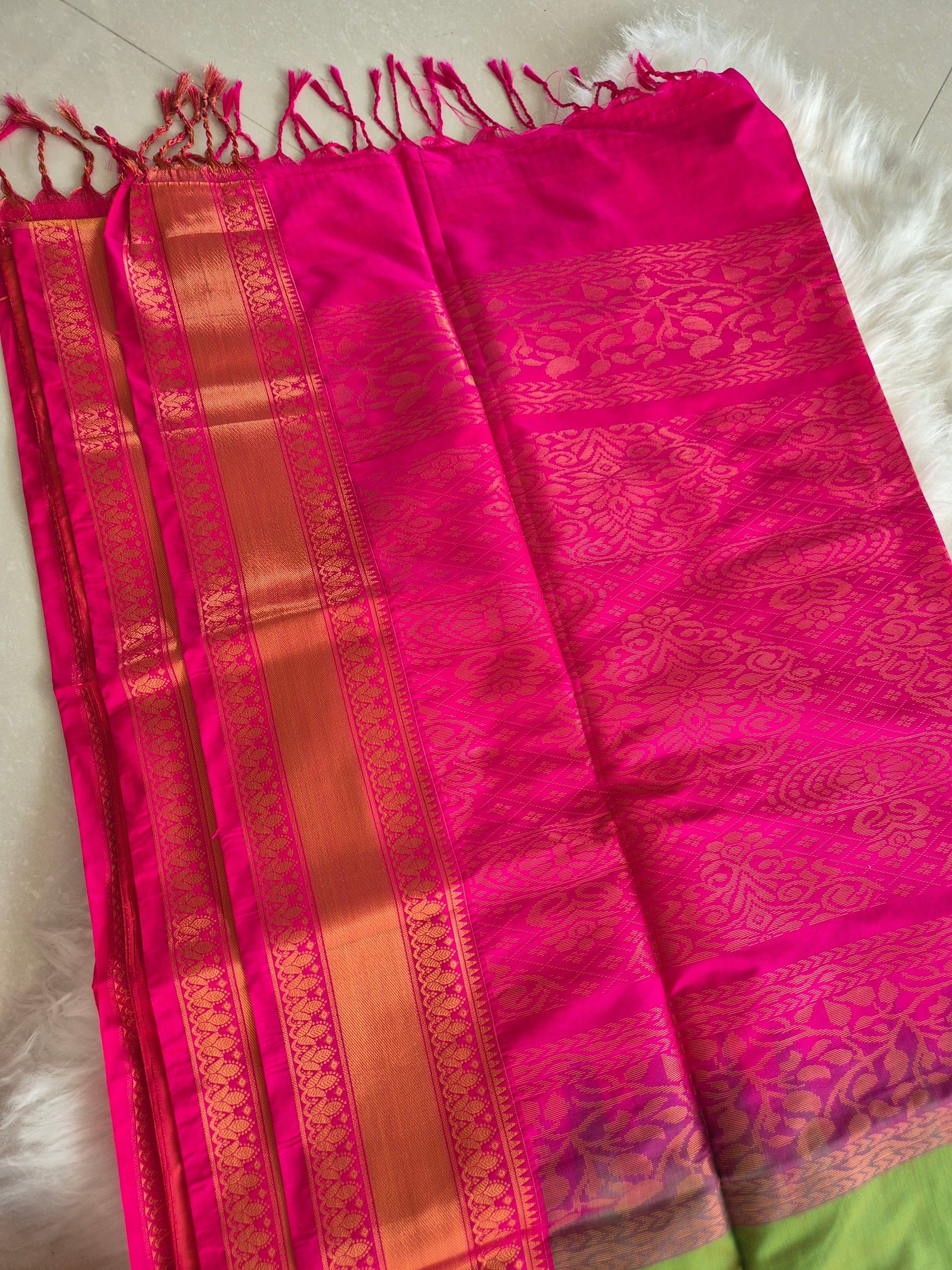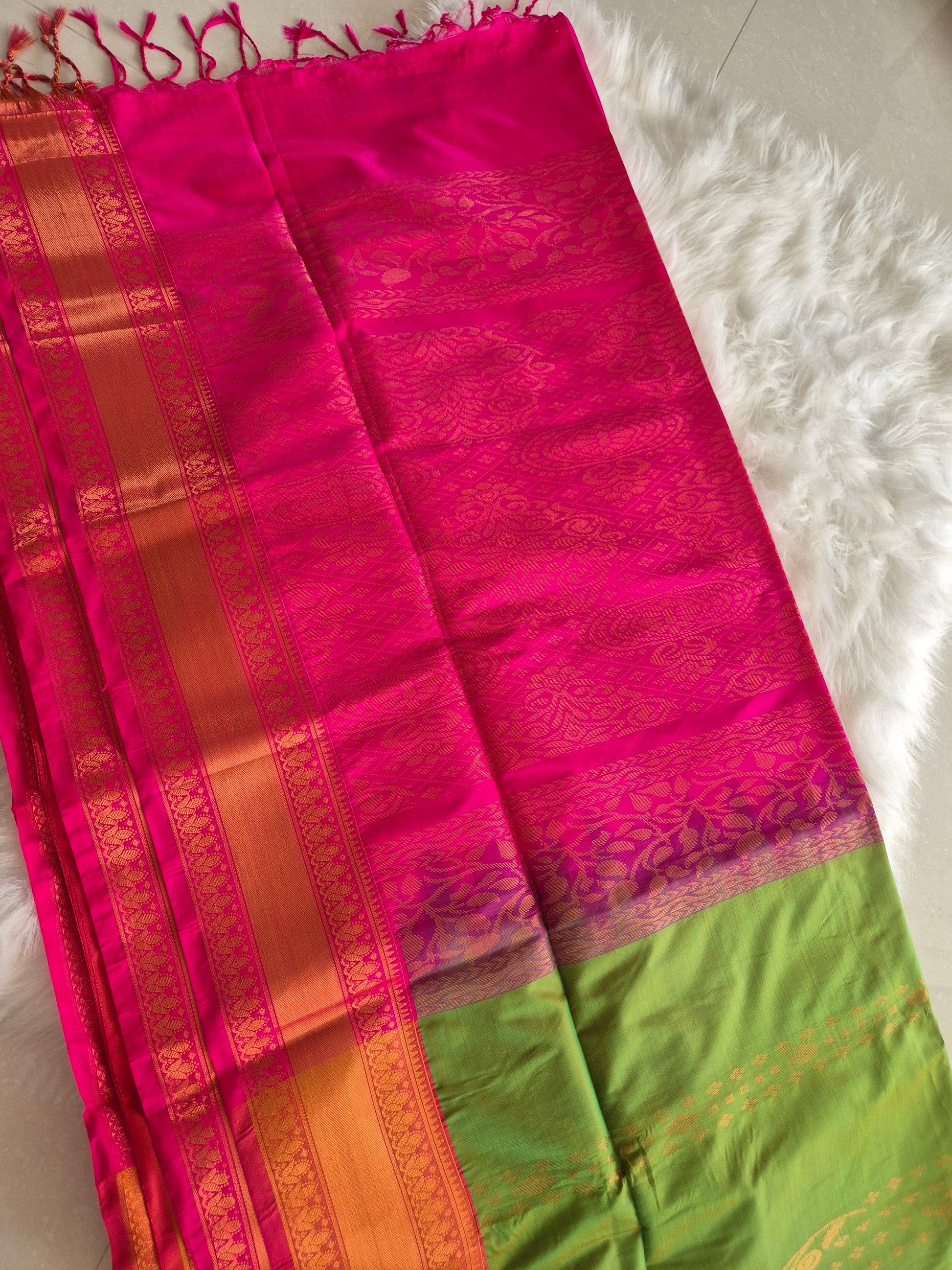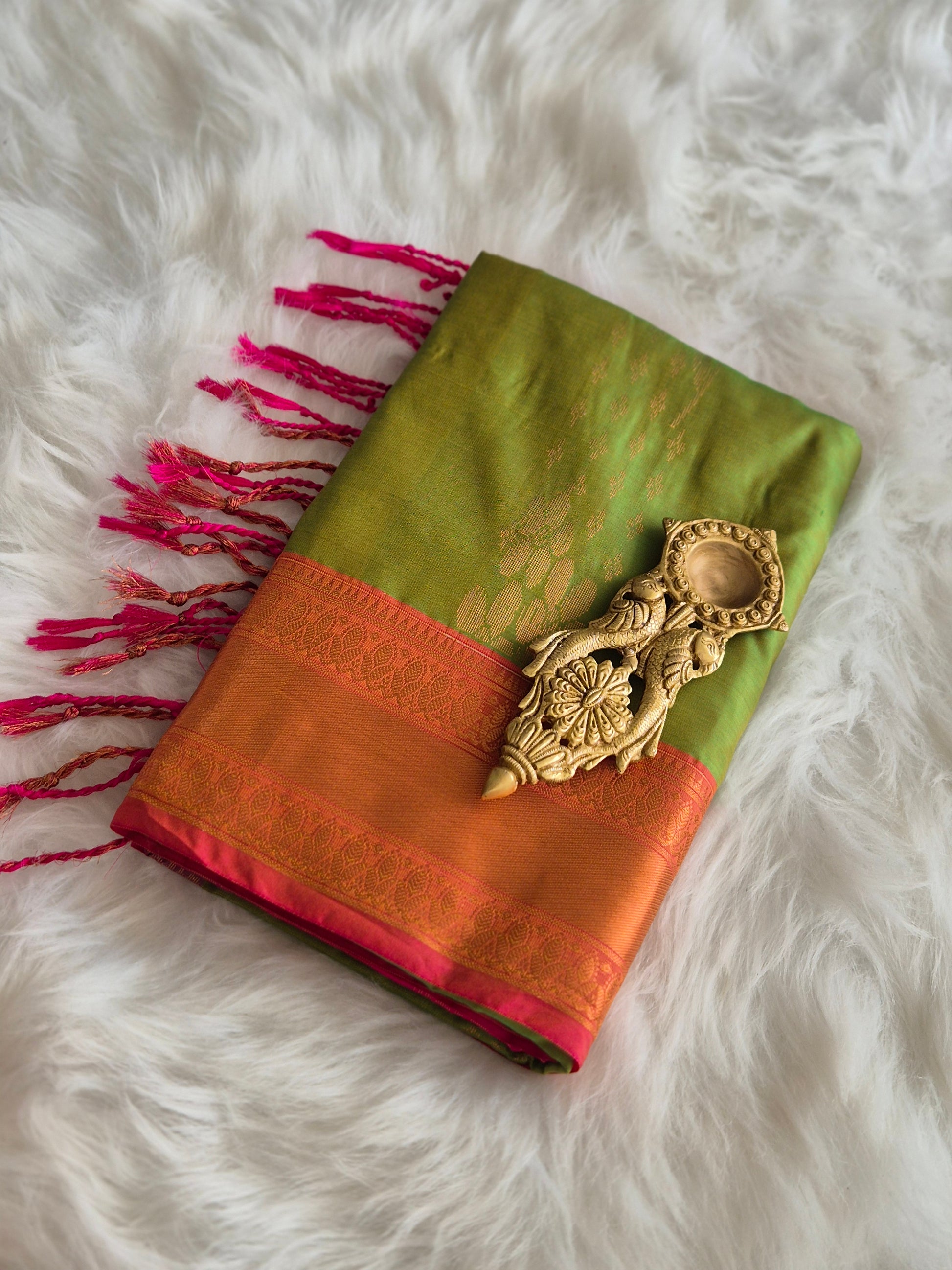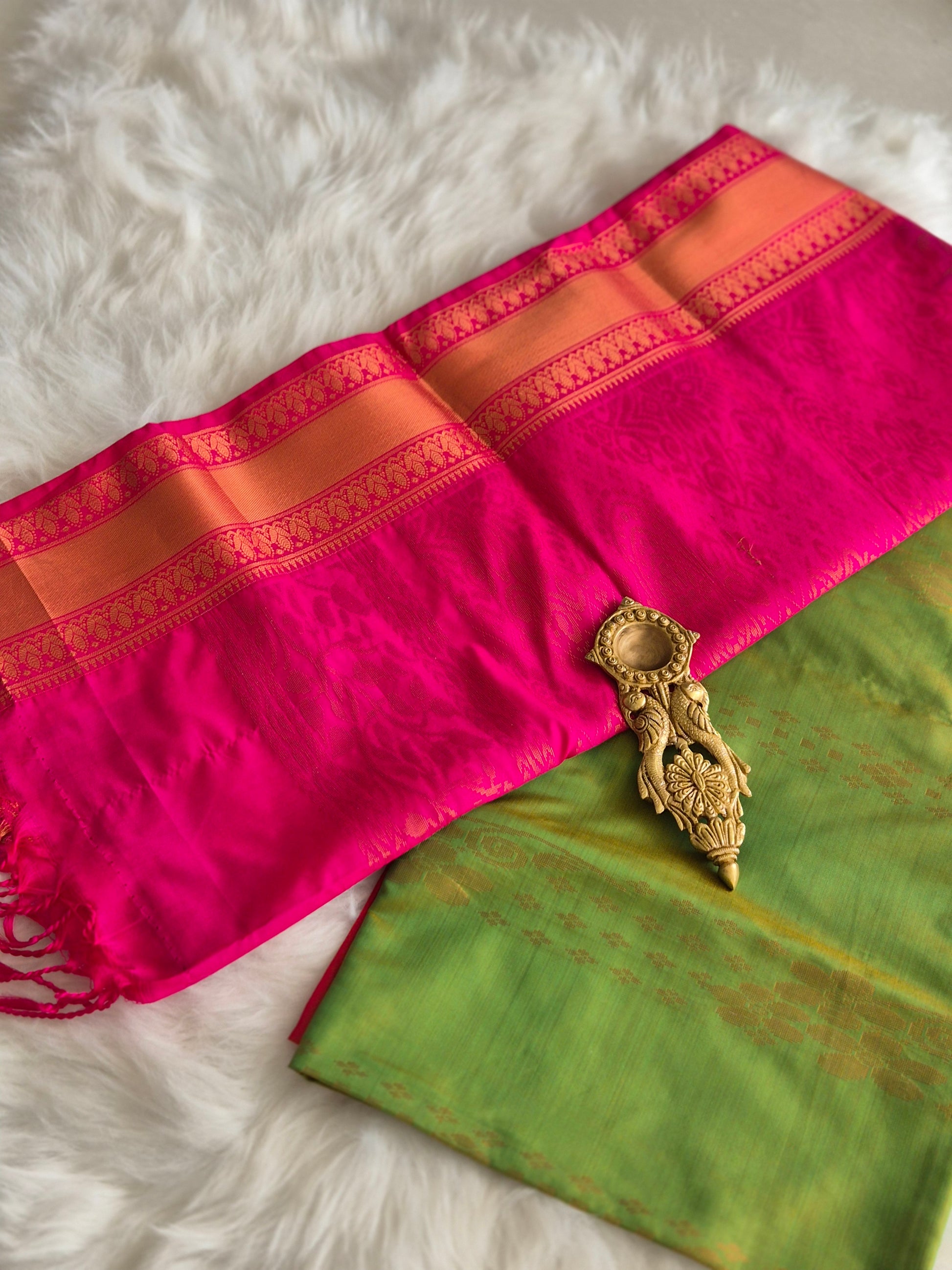 Beautiful Olive Green with Orange border and Rani Pink Pallu and Semi Silk Saree. Comes with Rani Pink Shade Running Blouse. Saree length is Approximately 5.5 Meters(Without Blouse Part).